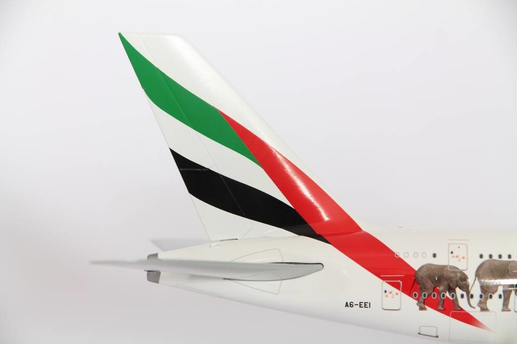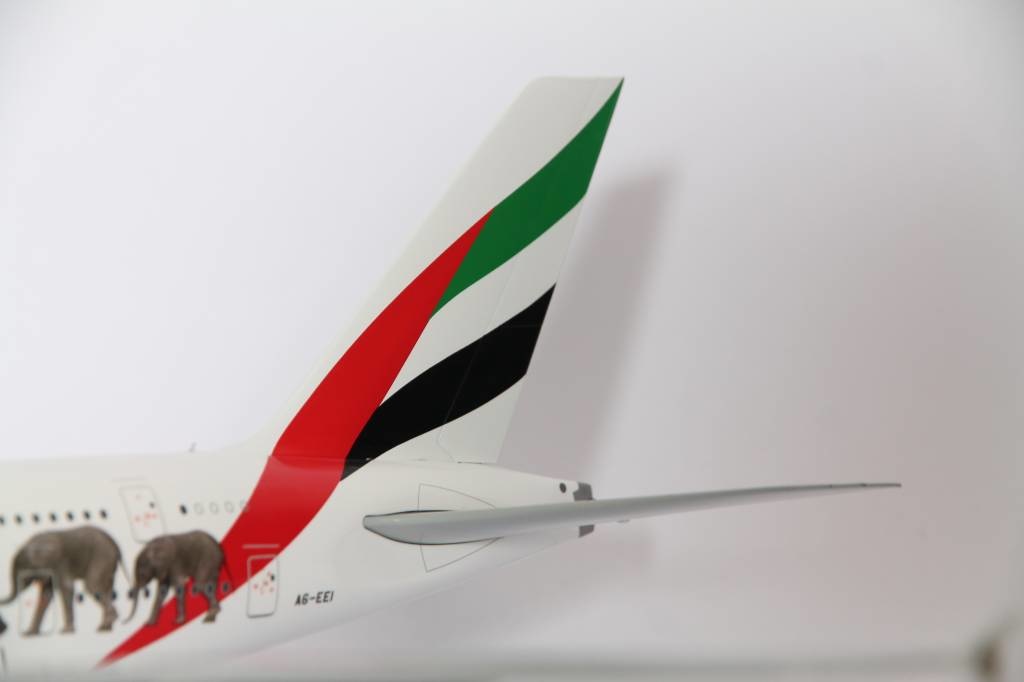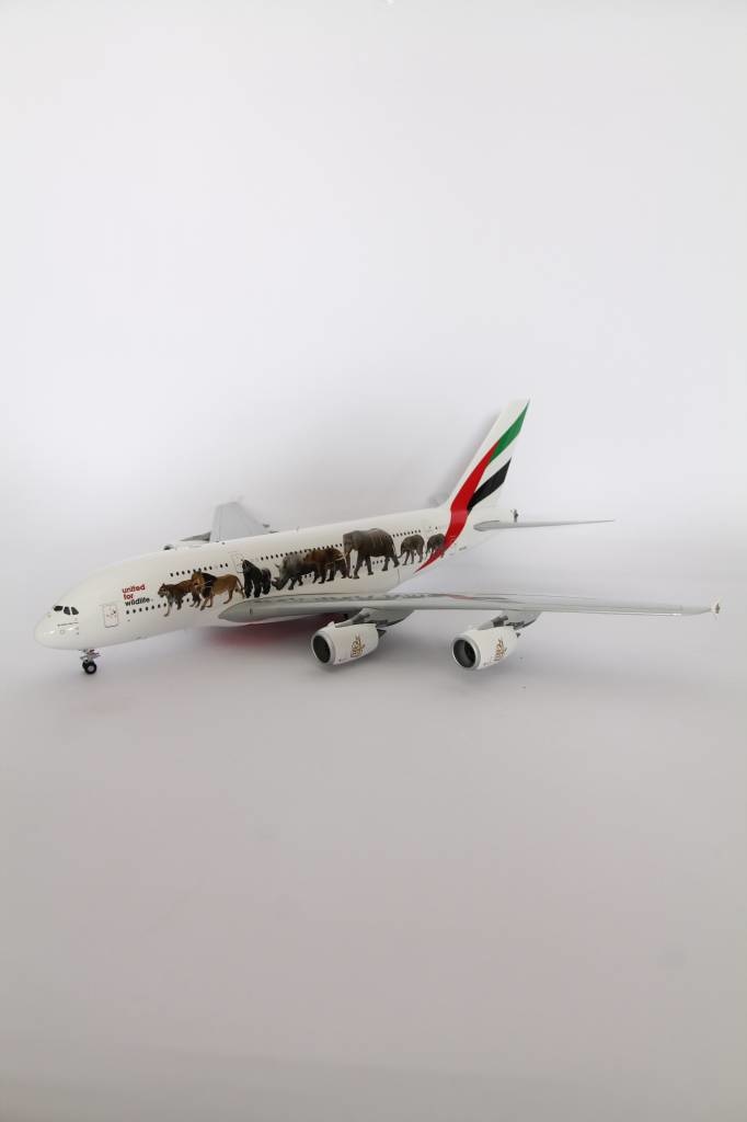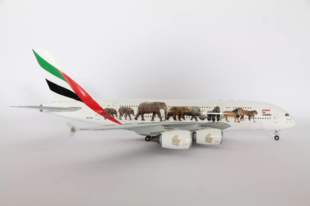 Emirates “Wildlife 1” Airbus A380-800 with registraties A6-EEI. Model can be displayed gear-up and down. Contains antennas, steerable nose gear, rolling gears, rubber tyres and "jeweled" beacons.