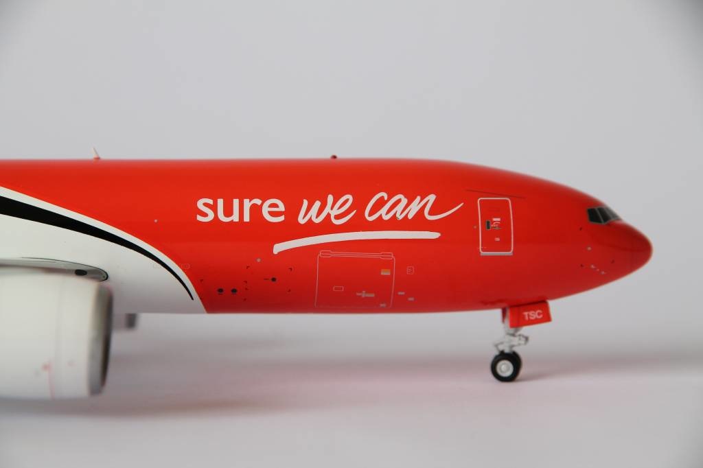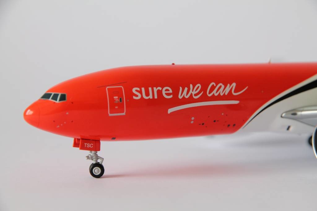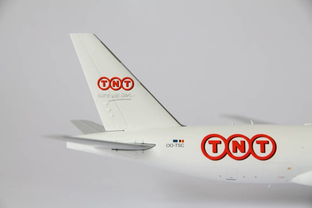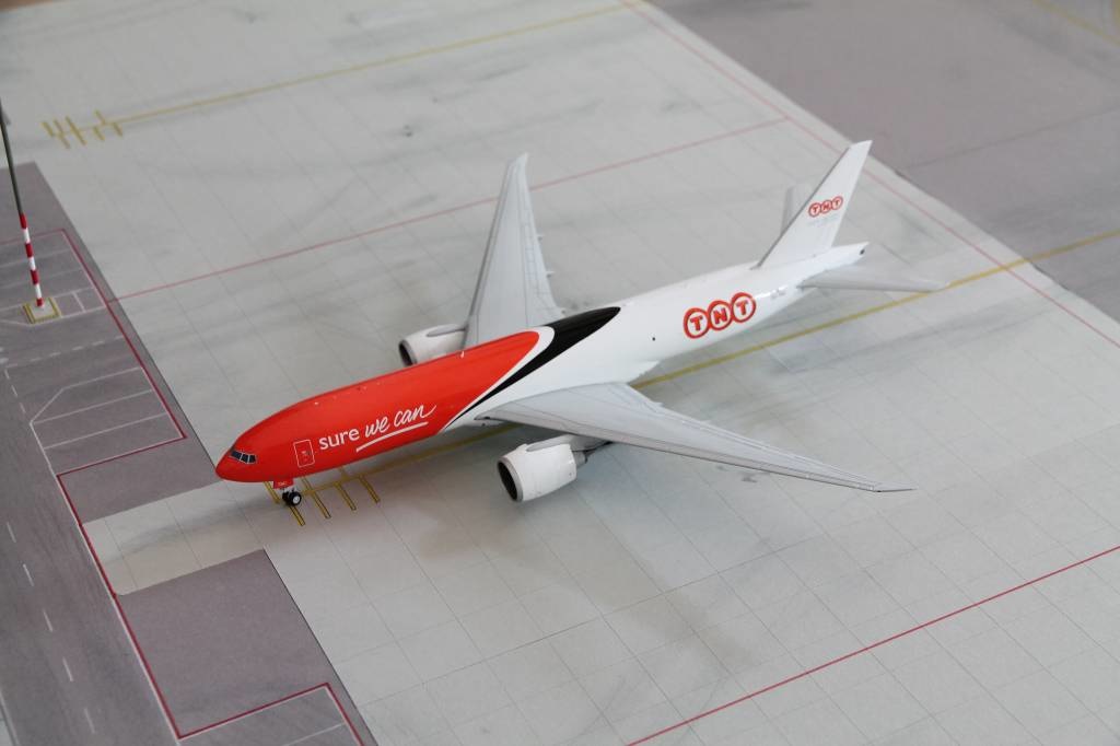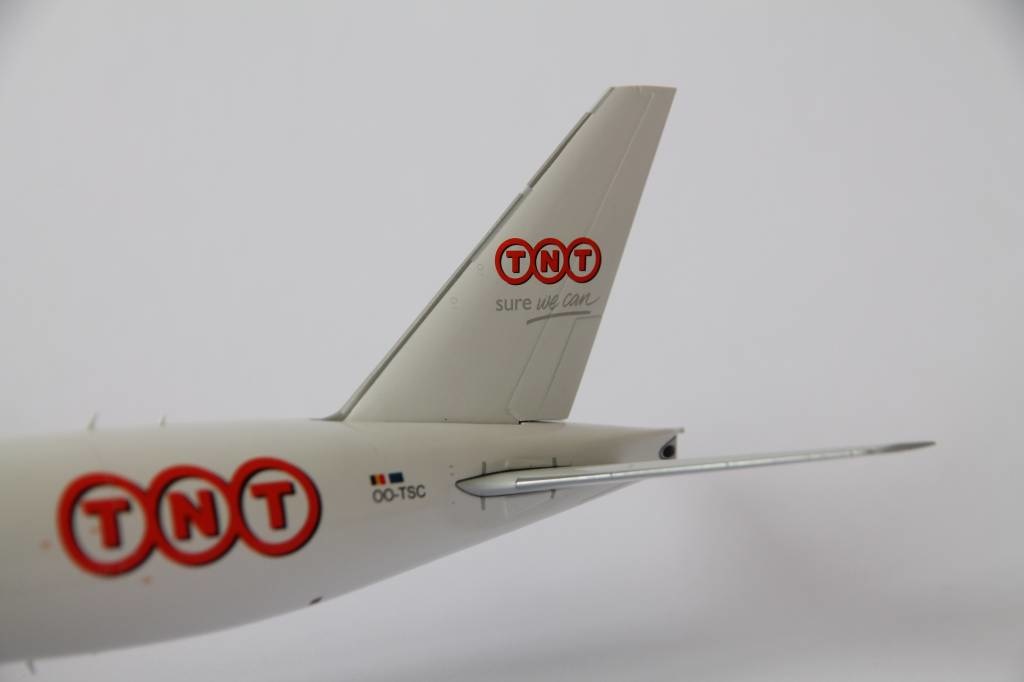 TNT Cargo Boeing 777-200F Freighter with registration OO-TSC. Model can be displayed gear-up and down. Contains antennas, steerable nose gear, rolling gears, rubber tyres and "jeweled" beacons.