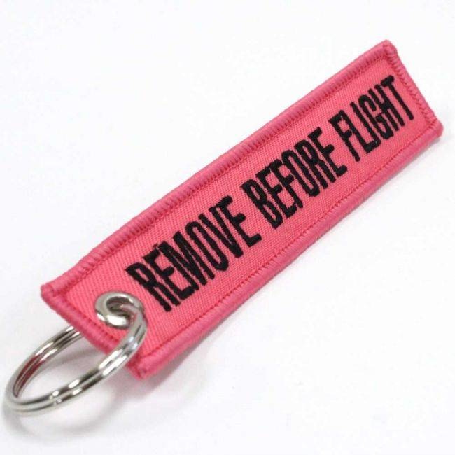 Sleutelhanger met "Remove Before Flight" borduursel.